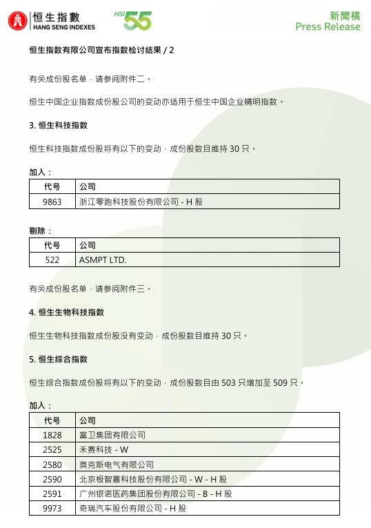 其中旺财28APP,信达生物制药纳入恒生指数;中国宏桥、信达生物制药、百胜中国纳入恒生中国企业指数,新奥能源、海底捞、新东方被剔除;零跑汽车纳入恒生科技指数旺财28APP,ASMPT被剔除;富卫集团、禾赛科技、奥克斯电气、极智嘉、银诺医药、奇瑞汽车纳入恒生综合指数。