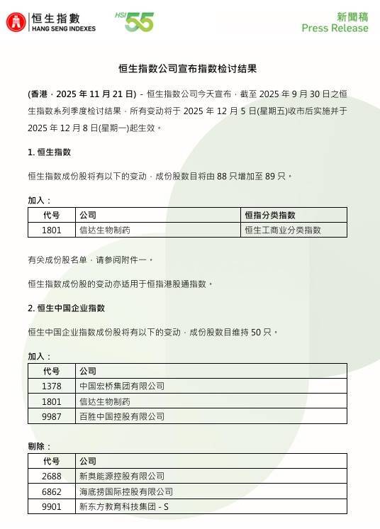 风暴娱乐【大河财立方消息】11月21日,恒生指数公司宣布指数检讨结果。