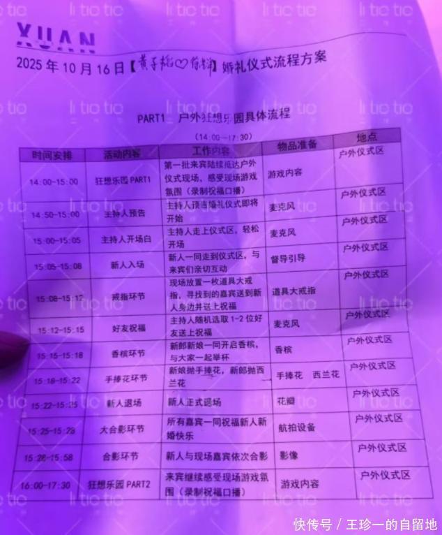 根据已经曝光的婚礼仪式流程图可知旺财28登陆,黄子韬和徐艺洋的婚礼是在下午举行,黄子韬也如约开启了直播。